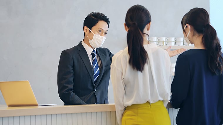 リモート接客とは、ビデオ通話を活用してオンライン上で行う接客システムのことです。アプリケーションが必要なシステムもありますが、インターネット環境さえ整っていれば導入は難しくありません。たとえば、これまでは実店舗にいた接客スタッフを減らし、別の場所で待機しているスタッフがオンラインで来店客の要望に応えるといった使い方です。インターネットを介した画面でのやり取りなので、コロナ対策という観点からは、客と従業員の濃厚接触と飛沫感染を100%防ぐことができます。経営側からすれば、一人のリモート接客スタッフが複数の店舗をフォローできるので効率的な人材活用ができます。雇用したくても財政逼迫でできないという企業や店舗にとっては、人件費をかけずに受付窓口業務やカウンター業務などを必要最低限の要員で回せることがメリットです。