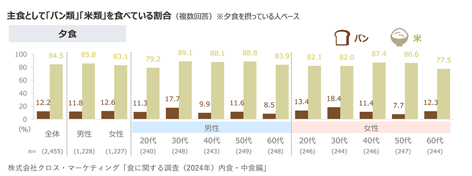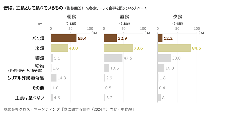 主食の選択には、大まかな傾向があることがわかりました。朝はパンで、それ以外はごはんが選ばれています。食の多様化が進むなか、食べ方のバリエーションも広がっていくことでしょう。