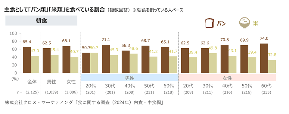 朝食にパンを食べる割合は、男性62.5%、女性68.1%と高めですが、中でも40代女性と60代女性が70%以上と高い値になっています。最も低いのは20代男性で、50.7%でした。