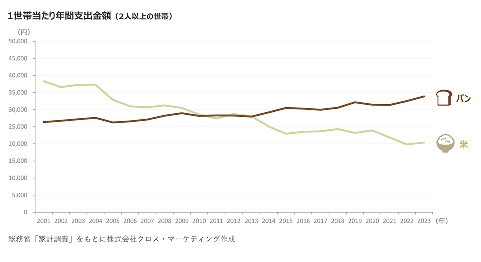 近年はパンの消費額がごはんの消費額を上回っていますが、物価や健康意識の高まりで、今後はさらに変化していくかもしれません。食のマーケティングにも注目していきましょう。
