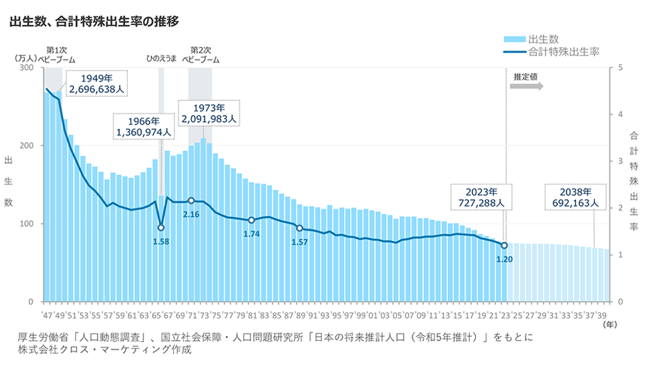 2025年2月に公表された「人口動態統計速報(令和6年12月分)」によると、2024年の出生数は72万988人でした。この速報の出生数には外国人も含むため、日本人のみの出生数は例年通りに推移すると69万人程度になると予想されます。国立社会保障・人口問題研究所が2023年に公表した「日本の将来推計人口(令和5年推計)」によると、日本人のみの出生数が70万人を下回るのは2038年になると推計しており、予測よりも約15年早く少子化が進むことになります。