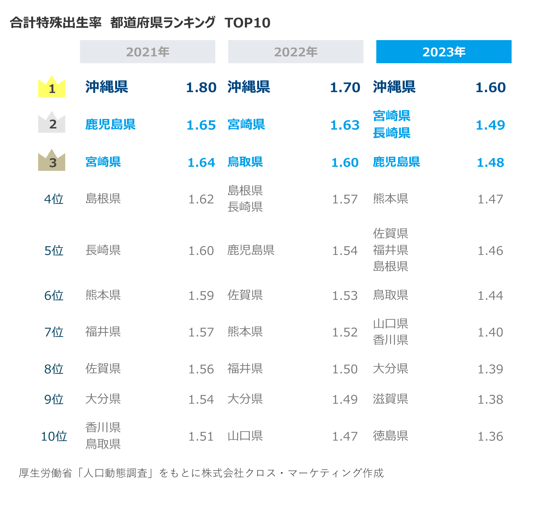 まずは2021年、2022年、2023年の上位10位の都道府県と合計特殊出生率を紹介します。