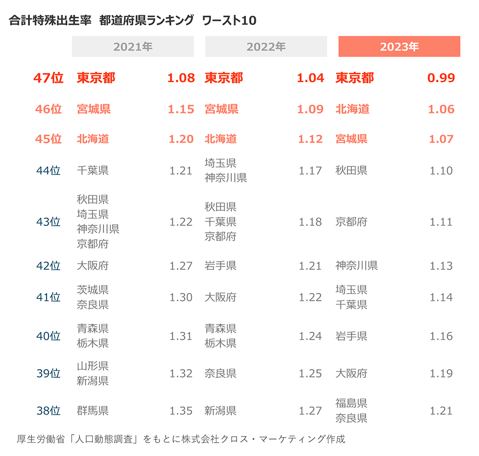 次に、2021年、2022年、2023年の下位10位の都道府県と合計特殊出生率を紹介します。