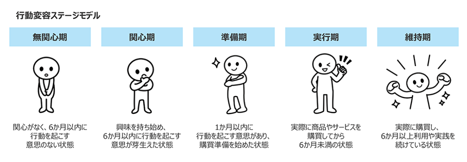 行動変容とは、人の意識によって行動が移り変わる工程です。消費者の意識は、無関心期・関心期・準備期・実行期・維持期の5つのステージに分かれています。