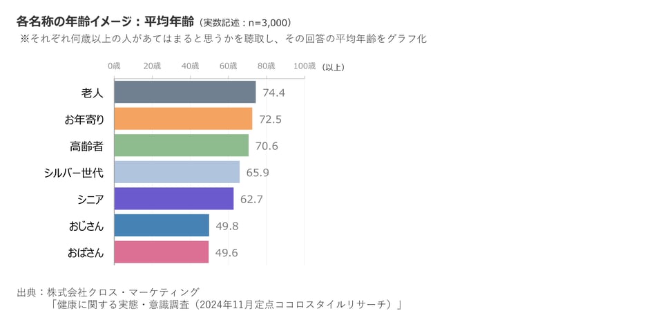 上記のグラフから、年代が上がるにつれて、全体的に年齢のイメージも緩やかに上昇する傾向があります。一方「おじさん」や「おばさん」という名称は、50代までは比較的安定した年齢のイメージですが、60代以降で上昇しています。