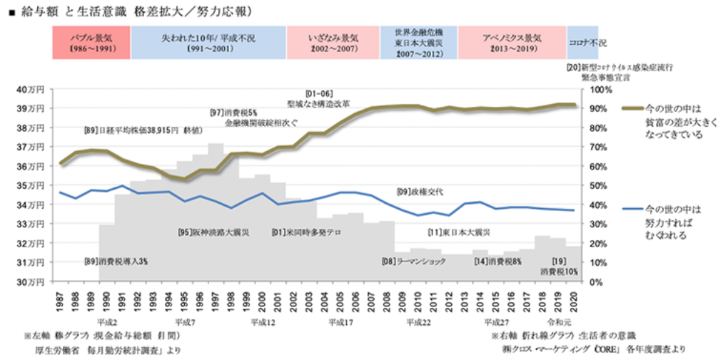 下記は、調査結果の一例で30年間の給与額と生活意識の変化をグラフに表したものです。2000年代から、貧富の格差が拡大したと思う人の割合が増えていることがわかります。