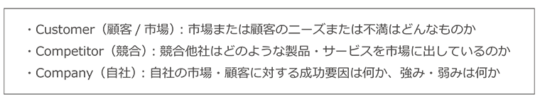 「3C分析」の3項目は、それぞれ、以下のような分析を行います。
