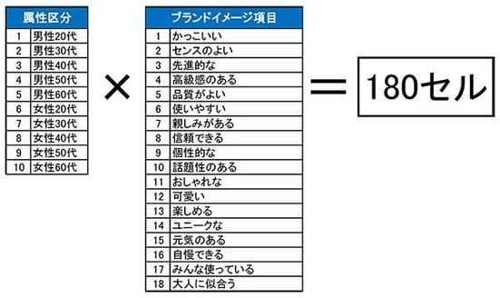 例えば、ある商品ブランドのイメージ評価を対象者の性・年代別の10区分を基準として分析したいと思った時、分析の対象となるイメージ評価項目が18カテゴリー(選択肢)あったとしたら、下記のように180セルのクロス集計表を読み込み、傾向を端的に表すにふさわしい図表またはグラフを作成することになります。