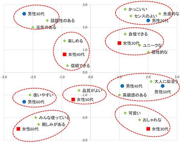 ここで、各項目の近くに位置するもの同士に類似性があるという読み取りができます。 今回は、各性・年代別のある商品ブランドへのイメージ評価を解析することが目的ですから、性・年代のプロットされた位置に近いイメージ項目が、その性・年代層がもっているブランドイメージであると解釈します。 【アウトプットイメージ:コレスポンデンス分析】