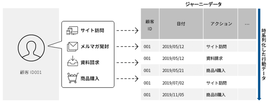 点在する顧客の行動に関するデータをID単位で集約し、行動の時系列に沿って統合したデータを指します。