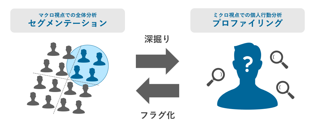 分析注力ターゲットとした各セグメントにおける、代表的な顧客の行動を時系列で確認。購買商品や場所、時間など様々な要素から顧客をプロファイリングし、フラグとして再度セグメンテーション分類に反映します。