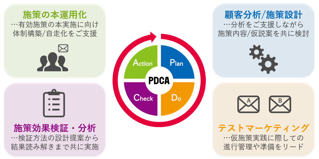ジャーニーデータ分析に加えて、分析結果を施策として実際に実践し検証する運用サイクルを伴走支援します。自走化や体制構築のご支援も可能です。