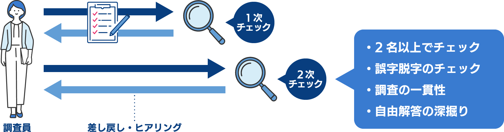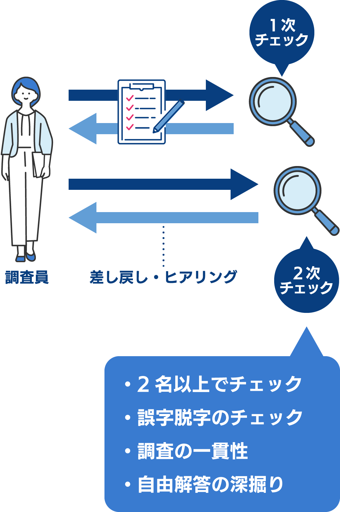 調査員が記入したレポートは必ず2名以上でチェック。疑問点はヒアリングをし、コメント内容が薄い・わかりにくいという場合には書き直しをさせ、ご納品物を完成させます。