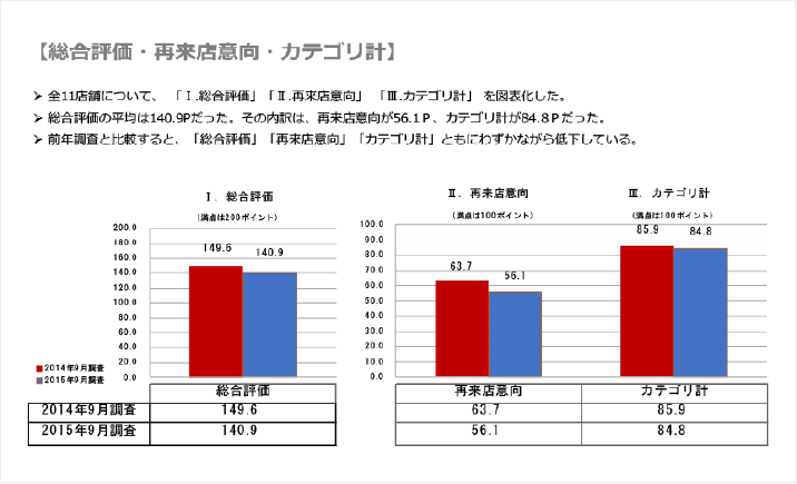個票(各店舗の結果がわかるレポート)はわかりやすいか、サマリーレポート(個店ではなく全体やエリアごとなど強みや弱みの分析・優先的に改善すべきと思われる点はどこと思われるか等の分析)の作成がどこまでできるかなども覆面調査(ミステリーショッパー)の会社を選ぶ際に注意が必要です。