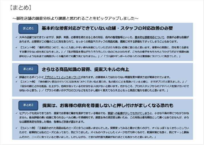 ※分析の他、調査結果をもとにプログラムを作成する研修、調査結果をもとにどこをどのように改善すべきかを店長や店舗スタッフに自ら考えてもらうワークショップの実施もできます。