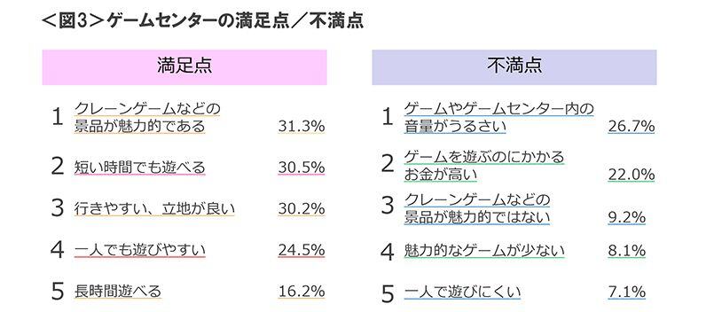 ゲームセンターの満足点では【クレーンゲームなどの景品が魅力的である】(31.3%)、【短い時間でも遊べる】(30.5%)、【行きやすい、立地が良い】(30.2%)がそれぞれ30%を超えて上位にあがっている。不満点では、【ゲームやゲームセンター内の音量がうるさい】(26.7%)【ゲームを遊ぶのにかかるお金が高い】(22.0%)が他の項目と比べて特に高い結果となった <図3>