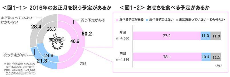 お正月を祝う傾向は昨年50.2%、今年48.9%とほぼ変わらず半数程度に留まる。祝う予定がある人のうち、おせち料理を食べる傾向は昨年78.1%、今年77.2%と、こちらもほぼ変わらず8割の人がおせちを食べる予定ありと回答 <図1>