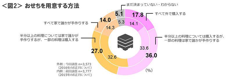 おせちの用意方法としては、【すべて外で購入する】(17.8%)、【半分以上の料理については購入するが、一部の料理は家で誰かが手作りする】(36.0%)と、外で購入派が半数以上を占め、前回の47.7%よりも増加した結果に <図2>