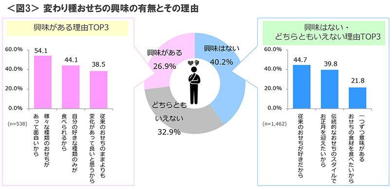 変わり種おせちの興味の有無では、【興味はない】が40.2%で最多。次いで【どちらともいえない】が32.9%、【興味がある】が26.9%となった。興味はない理由のトップは【従来のおせちが好きだから】(44.7%)、興味がある理由のトップは【様々な種類のおせちがあって面白いから】(54.1%)となった <図3>