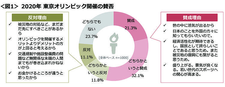 東京オリンピック開催は賛成が53%、反対が23%、どちらでもないが24%となった。賛成理由では「活気が出る」「景気向上や経済効果が期待できる」「若い世代のスポーツへの関心が高まる」などが挙げられ、反対理由では「先にすべきことがある」「交通規制や施設整備費など問題がある」などが挙げられた <図1>