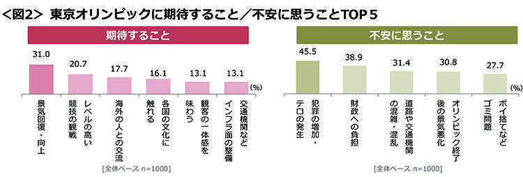 開催に伴って期待することは「景気回復・向上」(31%)がトップ。次いで「レベルの高い競技の観戦」(21%)、「海外の人との交流」(18%)となった。不安に思うことは「犯罪の増加・テロの発生」が46%と半数近くを占めてトップ。次いで「財政への負担」(39%)、「道路や交通機関の混雑・混乱」(31%)となり、経済活性化など開催による副次的効果や海外の人・文化の交流を期待しつつも、犯罪や財政負担を懸念する声が多く見られた <図2>
