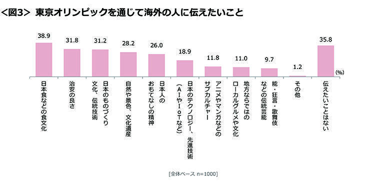 東京オリンピックを通じて海外の人に伝えたいことは「日本食などの食文化」(39%)、「治安の良さ」(32%)、「日本のものづくり文化、伝統技術」(31%)となった <図3>