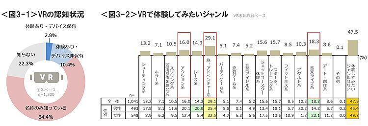 VRの認知状況は全体で77.6%。そのうち「VRを体験したことがある」は13.2%、さらに「VRデバイスを保有している」はわずか2.8%となった。VR未体験者に体験してみたいジャンルを聞くと、【旅・アドベンチャー系】が29.1%と最多。次いで【音楽ライブ系】が18.3%、【アクション系】が16.0%と続いた。<図3-1,図3-2>