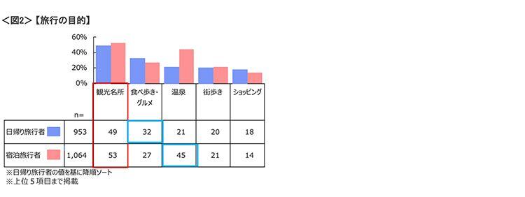 ■【旅⾏の⽬的】⽇帰り旅⾏では「⾷べ歩き・グルメ」、宿泊旅⾏では「温泉」が旅⾏⽬的の違いに