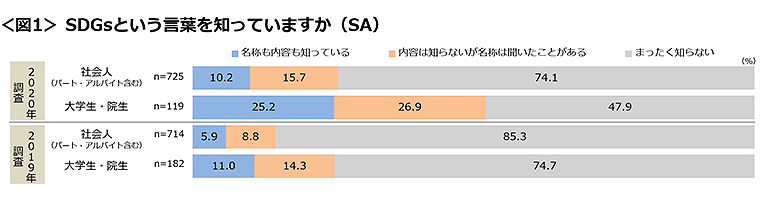 SDGsに対する認知度を2020年に調査した結果と2019年に調査した結果を社会人と大学生・院生で比較すると、どちらも1年間で認知度が大きく向上。特に大学生・院生の認知度向上が顕著であり、【まったく知らない】の割合が半数以下となる結果になった。<図1>