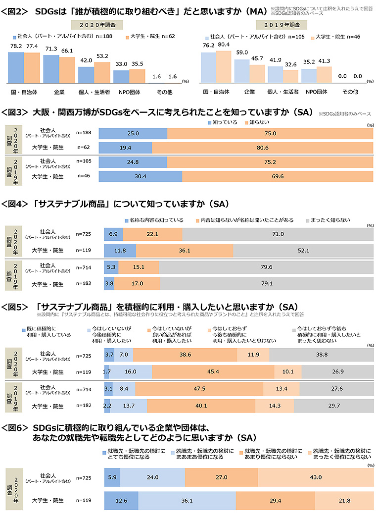 図1 SDGsという言葉を知っていますか 図2 SDGsは「誰が積極的に取り組むべき」だと思いますか、図3 大阪・関西万博がSDGsをベースに考えられたことを知っていますか、図4 「サステナブル商品」について知っていますか、図5 「サステナブル商品」を積極的に利用・購入したいと思いますか、図6 SDGsに積極的に取り組んでいる企業や団体は、あなたの就職先や転職先としてどのように思いますか