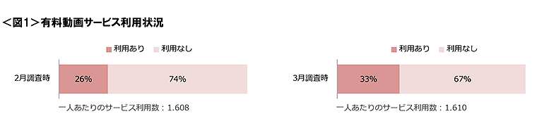 有料動画サービスの利用状況は2月調査時から3月調査時で26%から33%と127%増加。一方、一人あたりのサービス利用数に変化はみられなかった。<図1>