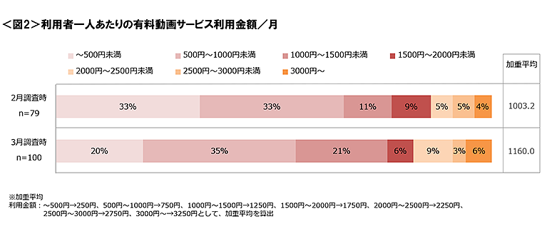 利用者一人あたりの有料動画サービス利用金額では、2月調査時から3月調査時で116%増加。<図2>