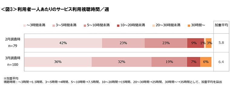 利用者一人あたりの有料動画サービス視聴時間では、2月調査時から3月調査時で111%増加。<図3>