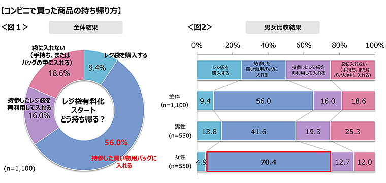 図1 コンビニで買った商品の持ち帰り方(全体)、図2 コンビニで買った商品の持ち帰り方(男女比較)