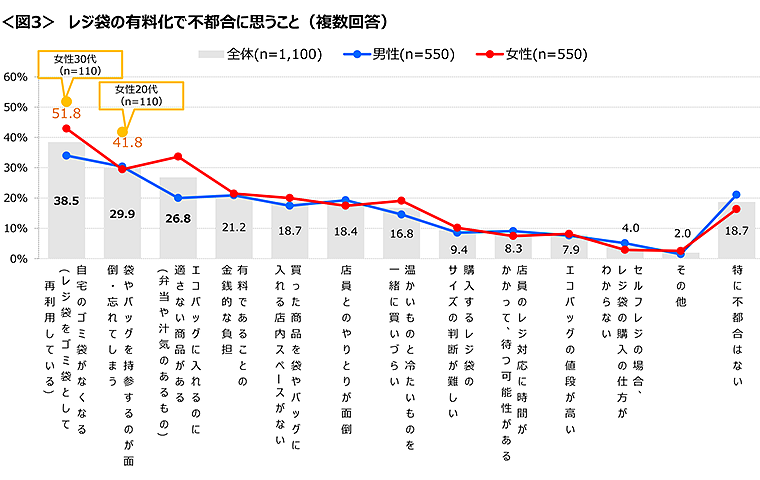 コンビニ利用に関わらず、レジ袋が有料化されたことで不都合に思うことのトップ3は、「自宅のゴミ袋がなくなる」、「袋やバッグを持参するのが面倒・忘れてしまう」、「エコバッグに入れるのに適さない商品がある」。男女別にみると、「自宅のゴミ袋がなくなる」と「エコバッグに入れるのに適さない商品がある」の2点は特に男性よりも女性が気にしていることがわかった。さらに性別×年代でみると、「自宅のゴミ袋がなくなる」が特に多かったのは女性30代で、半数以上に及んだ。<図3>