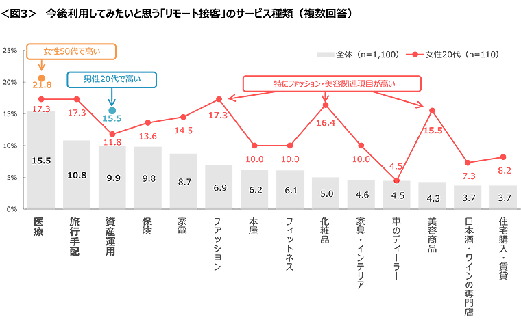今後利用してみたいと思うリモート接客のサービスは、全体で見ると「医療」(15.5%)が最も高く、「旅行手配」(10.8%)、「資産運用」(9.9%) が続く。性年代別で見ると「医療」は女性50代、「資産運用」は男性の20代が最も高い。また、女性20代は平均的にどの項目も高く、その中でもファッション・美容関連商品の項目が特に高い傾向。20代女性は画面越しのコミュニケーションに抵抗感が低い様子がうかがえる。<図3>