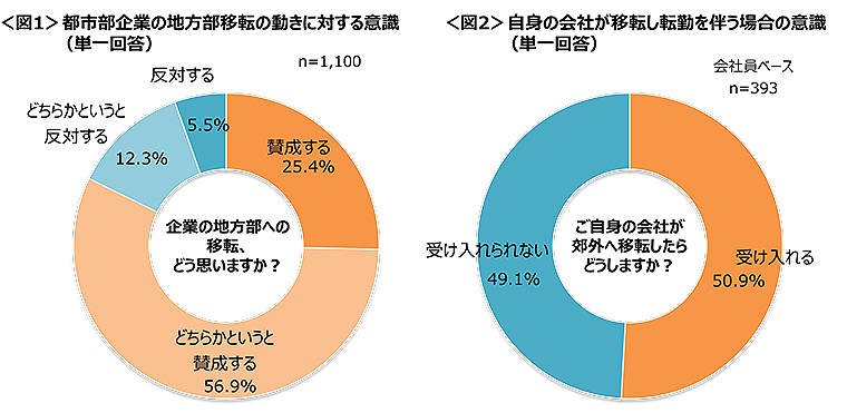 図1 都市部企業の地方部移転の動きに対する意識、図2 自身の会社が移転し転勤を伴う場合の意識