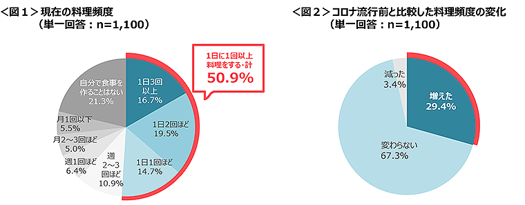 図1 現在の料理頻度、図2 コロナ流行前と比較した料理頻度の変化