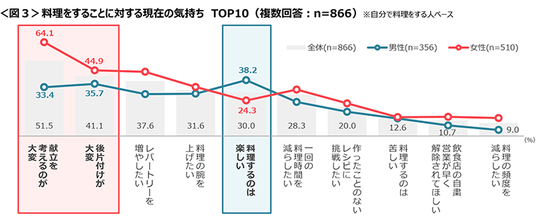 自分で料理をする人に現在の気持ちを聴取したところ、「献立を考えるのが大変」、「後片付けが大変」といった、準備や片付けの大変さが多く挙がり、特に女性の割合が高い。男性では、「料理をするのは楽しい」と回答した人が4割と最も多く、大変さよりも楽しさが勝っている様子。<図3>