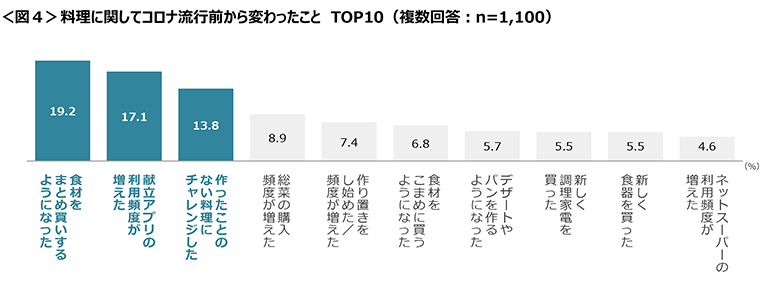 次に、「献立アプリの利用頻度が増えた」、「作ったことのない料理にチャレンジした」と続く。コロナの流行を受け、できるだけ人混みにいかないような工夫をしたり、家にいる時間を活用して新しい料理にチャレンジしている様子がうかがえる。<図4>