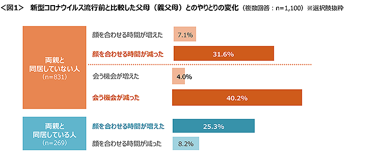 一方、両親と同居している人は、外出自粛などで在宅時間が増えた影響からか、「顔を合わせる時間が増えた」と回答した割合が25.3%となった。<図1>