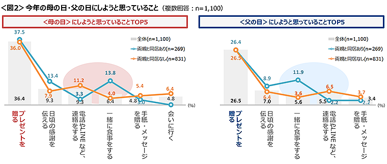 また、両親と同居している人は「一緒に食事をする」、同居していない人は「電話・LINEなど連絡をする」が比較的高い傾向。いずれにおいても、母の日・父の日には、両親に感謝を伝えたい、一緒に時間を過ごしたいと考えている様子が窺える。<図2>