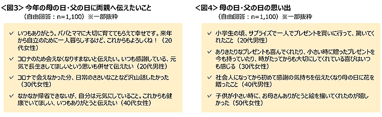 ◆今年の母の日・父の日に両親に伝えたいことは、日頃の感謝のほか、コロナ禍でなかなか会えない中、両親の健康を願う言葉が多くみられた。<図3>