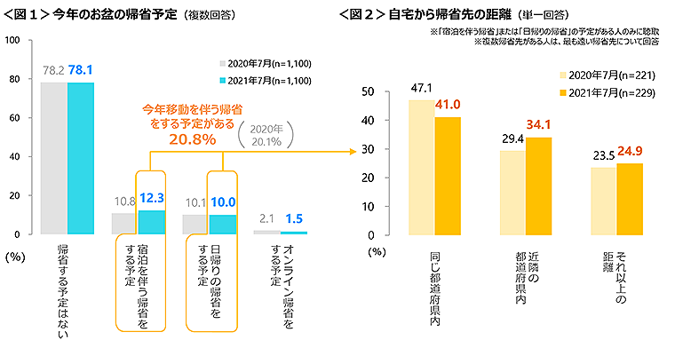 図1 今年のお盆の帰省予定、図2 自宅から帰省先の距離