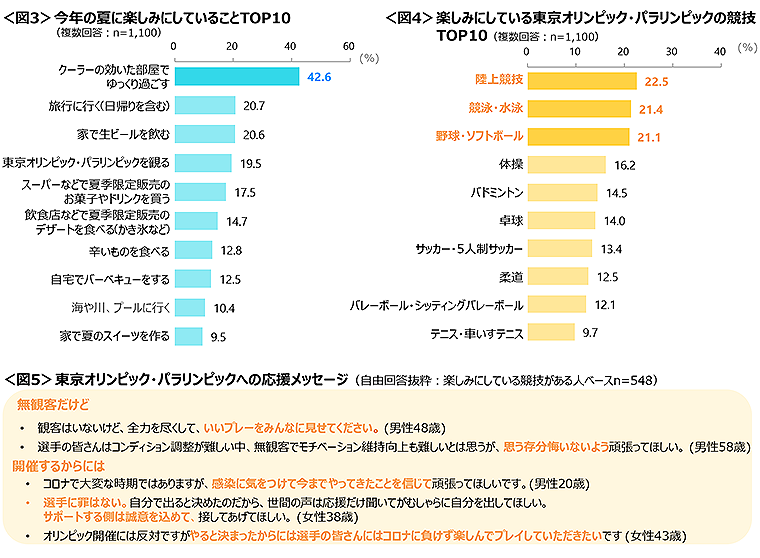 図3 今年の夏に楽しみにしていることTOP10、図4 楽しみにしている東京オリンピック・パラリンピックの競技TOP10、図5 東京オリンピック・パラリンピックへの応援メッセージ
