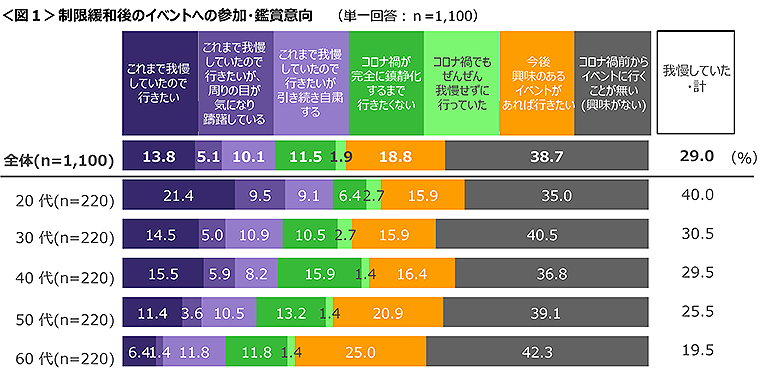 年代別にみると20代では「これまで我慢していたので行きたい」が2割で他の年代と比べて高い。なお、50代、60代でも「今後興味のあるイベントがあれば行きたい」が2割以上と、前向きな参加・鑑賞意向が見受けられる。