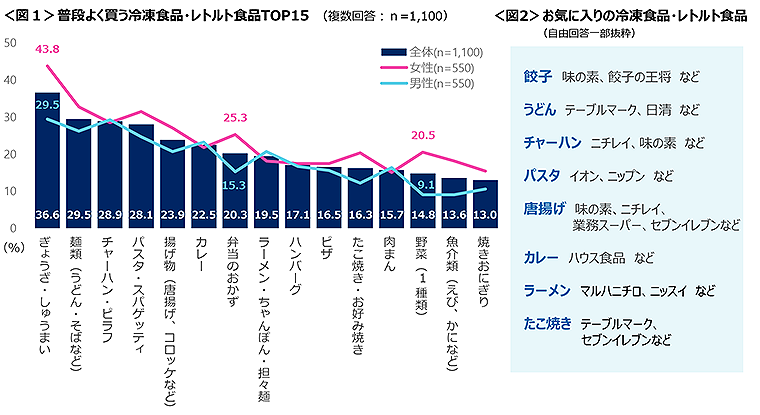 女性は「弁当のおかず」「野菜」が男性に比べて高い。お気に入りの冷凍食品・レトルト食品ではメーカーやブランドを指名する回答も多くあった。<図1、図2>