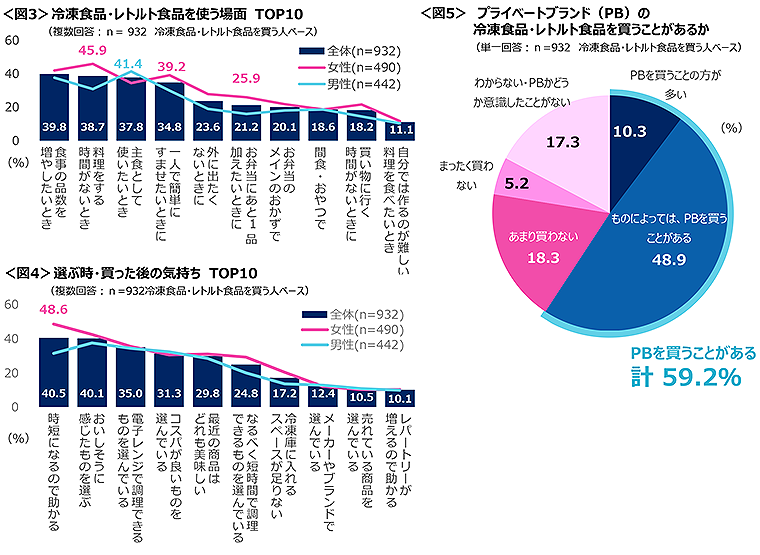 図3 冷凍食品・レトルト食品を使う場面TOP10、図4 選ぶ時・買った後の気持ちTOP10、図5 プライベートブランド(PB)の冷凍食品・レトルト食品を買うことがあるか