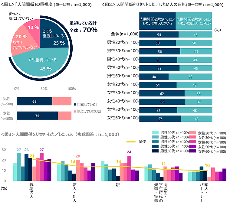 リセットしたい人間関係は、「職場の人」が21%と最も多く、次いで「友人・知人」と「親」の14%。性年代別にみると、男性30代、50代、女性40代において「職場の人」との人間関係リセットの経験や意向が強かった。「友人・知人」は女性20代、「親」は女性40代のリセット経験・意向が目立つ。<図3>