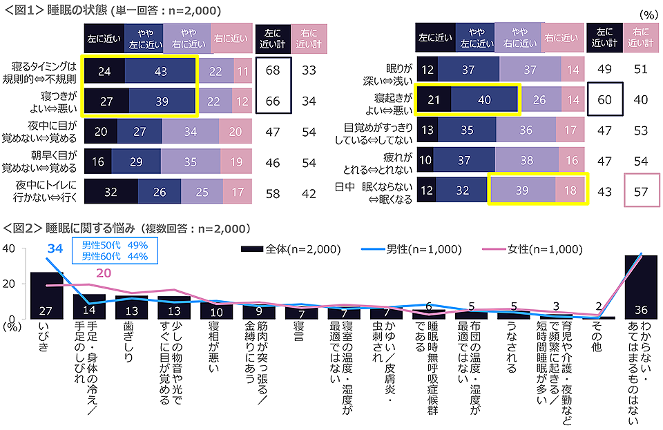 現在の睡眠状態について詳細を聴取したところ「寝るタイミングは規則的」「寝つきがよい」「寝起きがよい」人が6割を超える。一方、「日中眠くなる」は57%を占めた。睡眠に関する悩みは、全体で「いびき」「手足・身体の冷え/手足のしびれ」「歯ぎしり」「少しの物音や光ですぐに目が覚める」「寝相が悪い」がTOP5。男性の悩みの1位は「いびき」で34%、特に男性50~60代は4割以上と極めて高い。女性は「手足・身体の冷え/手足のしびれ」の20%であった。<図1、2>